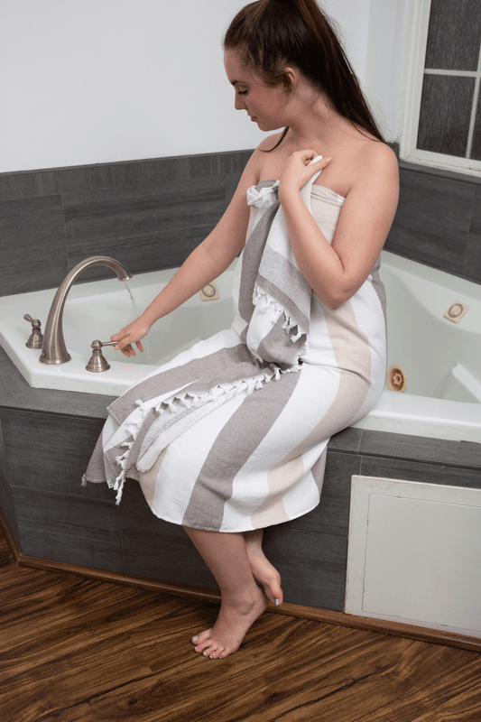 Kapris Striped Turkish Towel with Soft Terry Cloth Back in Grey and White