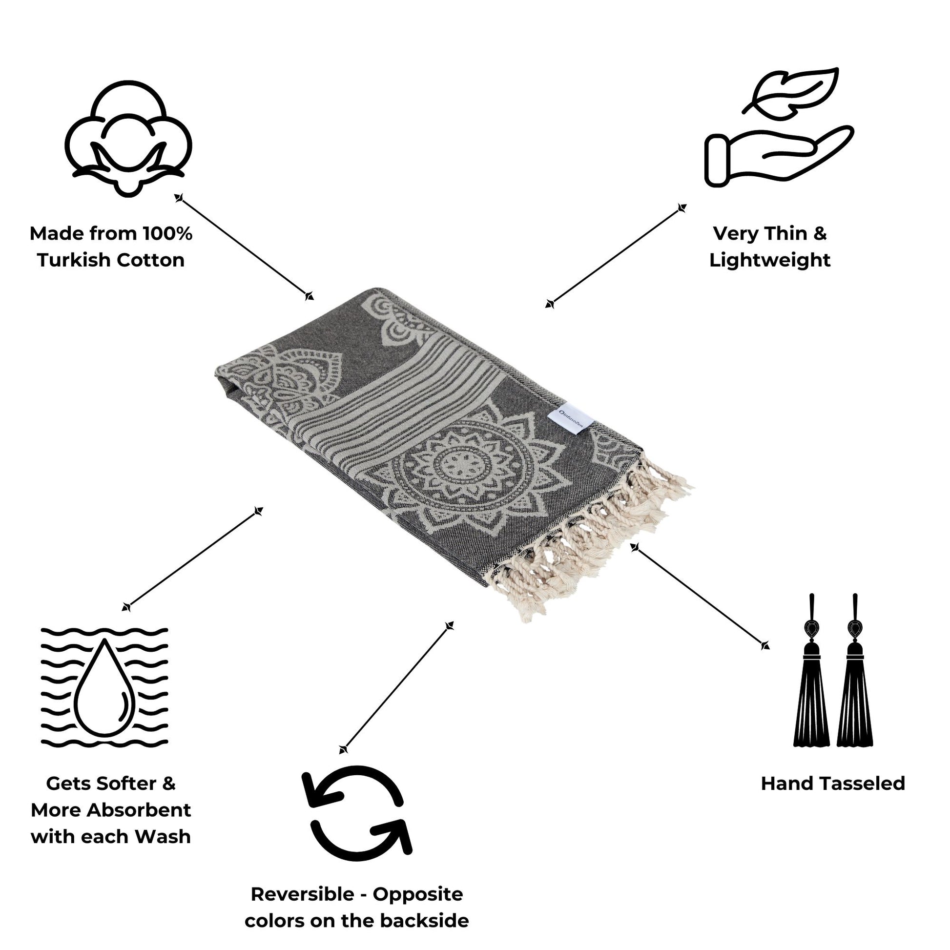 Soak up the sun with this beautiful reversible flower mandala Turkish towel on your beach chair! This towel is very versatile and is great for the beach, pool, gym or yoga. It also makes a great bath towel in your home that is not only decorative but functional as well.