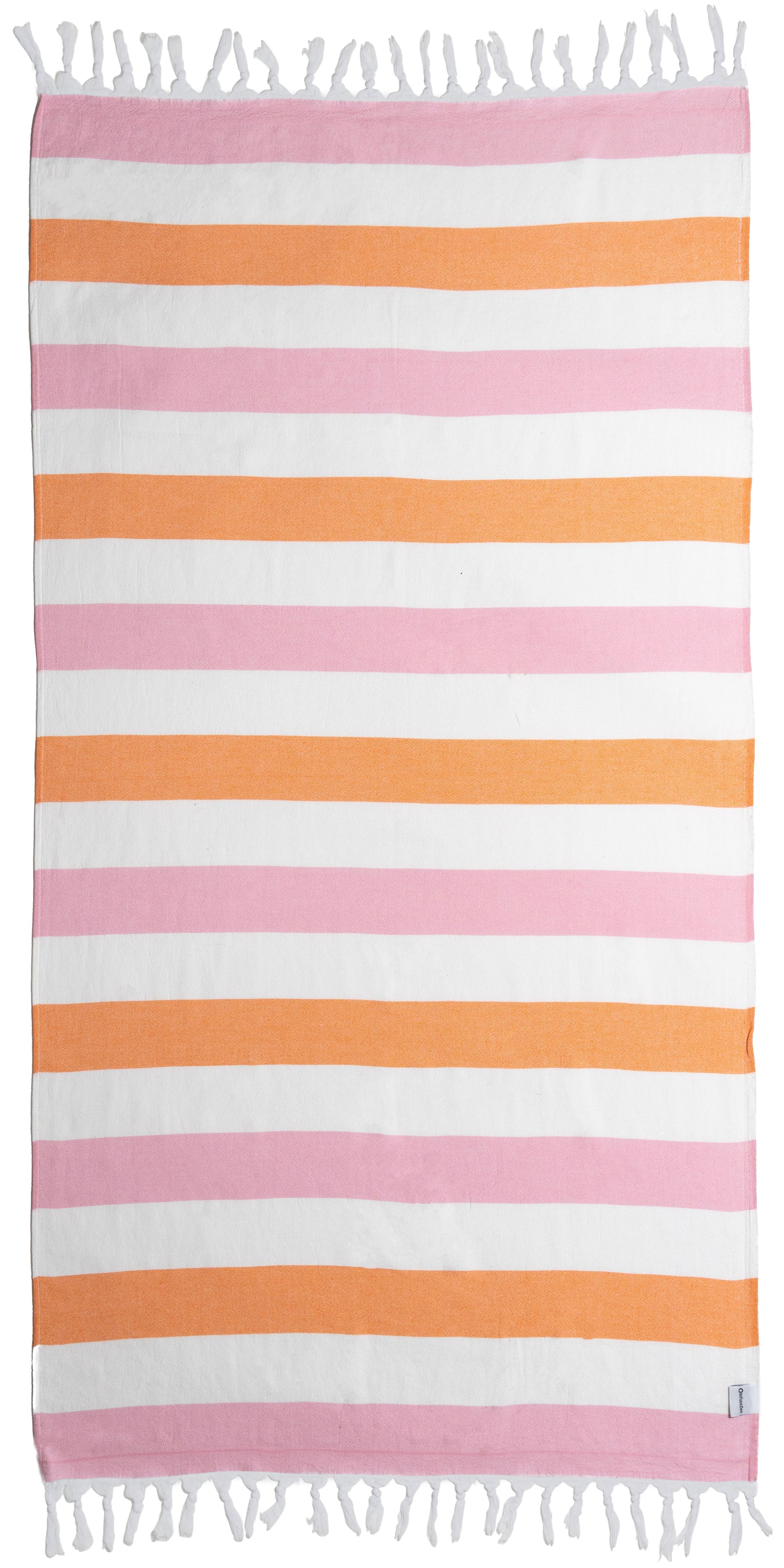 - This is our “Kapris” style – thick orange and pink stripes with a white base. Soft terry cloth on the backside, this will dry you off in a flash and feel great on your skin. Looks great in any bathroom or on a beach chair.