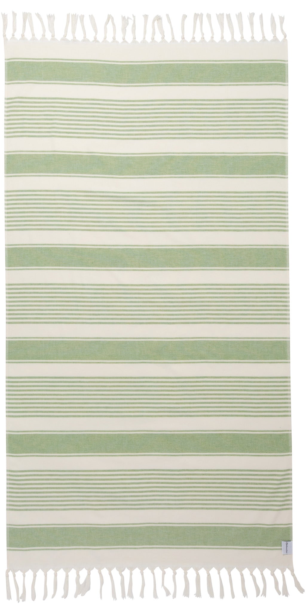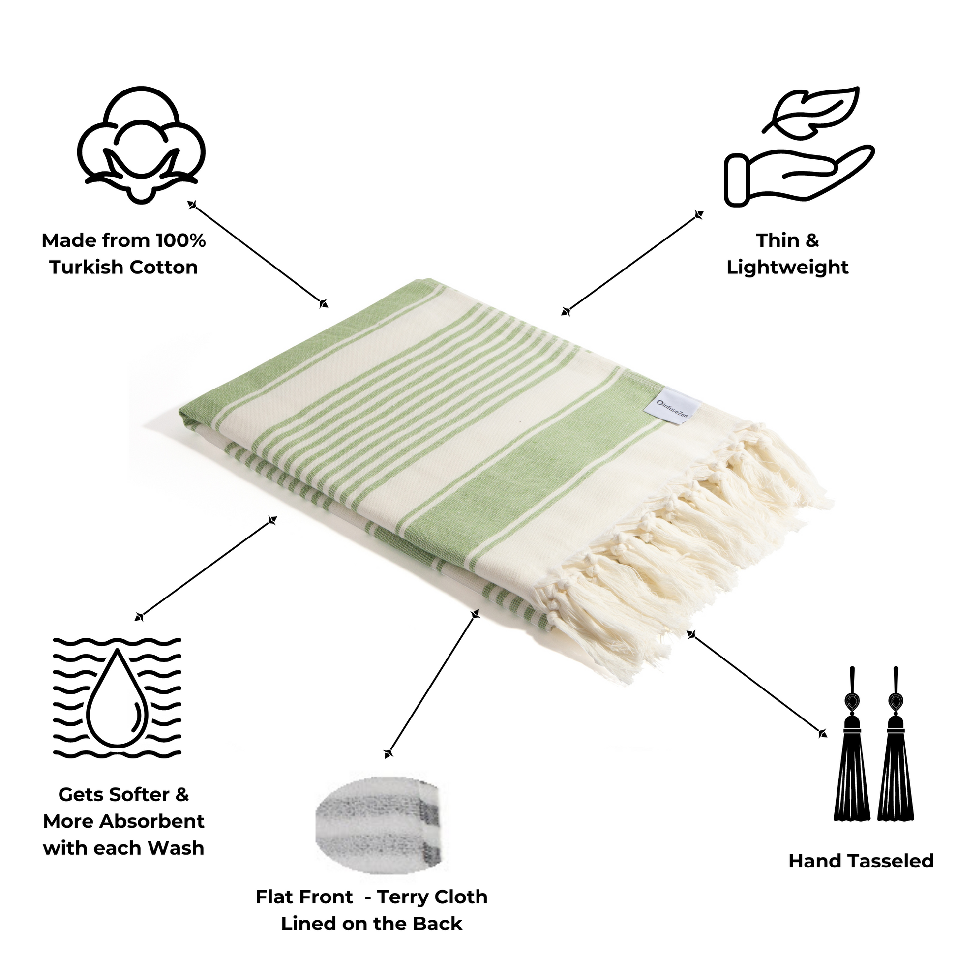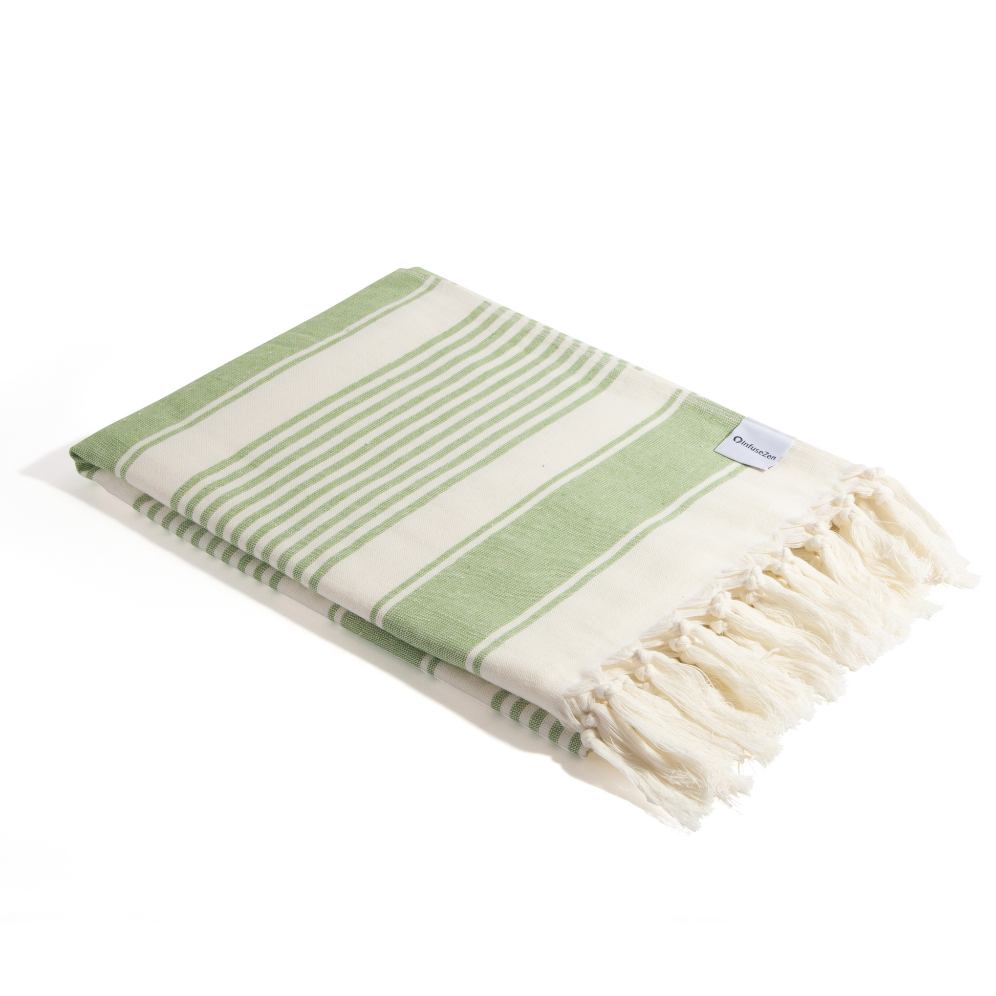 - Beautiful olive green stripes on the front with an ivory base, soft terry cloth on the back
